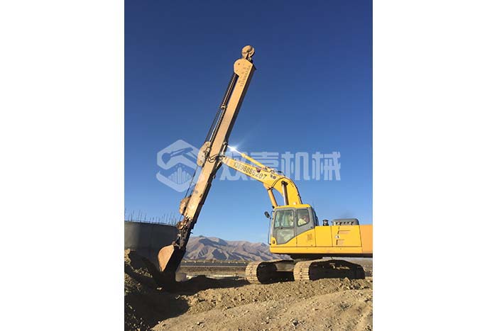 超長(zhǎng)四節(jié)臂:總長(zhǎng)度可達(dá)48米,臂內(nèi)可再伸出3節(jié),施工深度42.5米,配帶貝殼斗1.8立方或挖掘斗1.0立方。